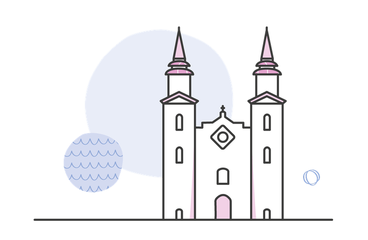 Illustration einer Kirche mit zwei Türmen und spitzen, rosa gefärbten Dächern
